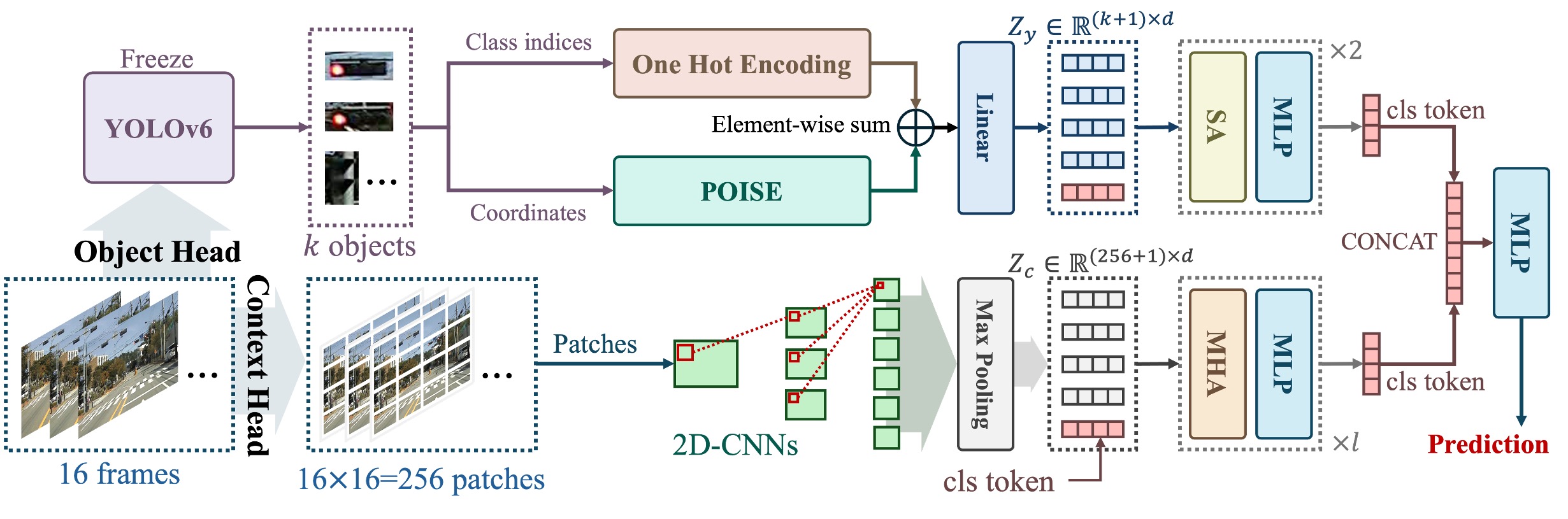 As car-sharing services evolve, there is a growing effort to analyze users’ safe driving behaviors and effectively manage shared vehicles. Unlike previous researches that focus on simple situations like sudden acceleration and lane departure using cameras with additional sensors, we introduce a new approach that detects more complex traffic rule violation, especially red-light violation, using only the monocular dashcam videos. The proposed framework employs the attention mechanism of Transformer, and effectively encodes the traffic signal objects and contextual information within the video. It utilizes a novel method, POISE (Positional Object Information by Spatial Encoding), to handle the positional information of traffic signal objects. Our quantitative and qualitative evaluations demonstrate the effectiveness of our proposed framework in detecting red-light violations compared to existing methods.